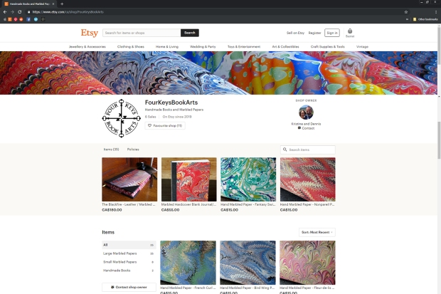 At Four Keys Book Arts our goal is to retain and revive the art of the book. We use tried-and-true methods of book construction that are unrivalled by mass-produced notebooks. Our marbled papers are crafted by hand, one at a time, just as they have been for centuries, each one as unique as a fingerprint. And we give unwanted books a second life by upcycling their pages into handsome and useful notebooks. Whether you are a grocery-list jotter, a dedicated writer, or a maker yourself, our handmade books and papers will add a touch of history and beauty to all your endeavors.
