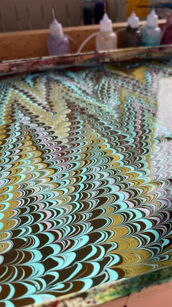 Paper Marbling is the art of creating designs by floating paint on a fluid bath, then transferring that pattern onto paper. We use primarily acrylic paints for our papers, resulting in a final product that is as colour-fast as it is beautiful. Each printed sheet is entirely unique. We can create matching editions of a design by using the same colours and techniques, but the fluid nature of the process means that no two sheets will ever be alike.